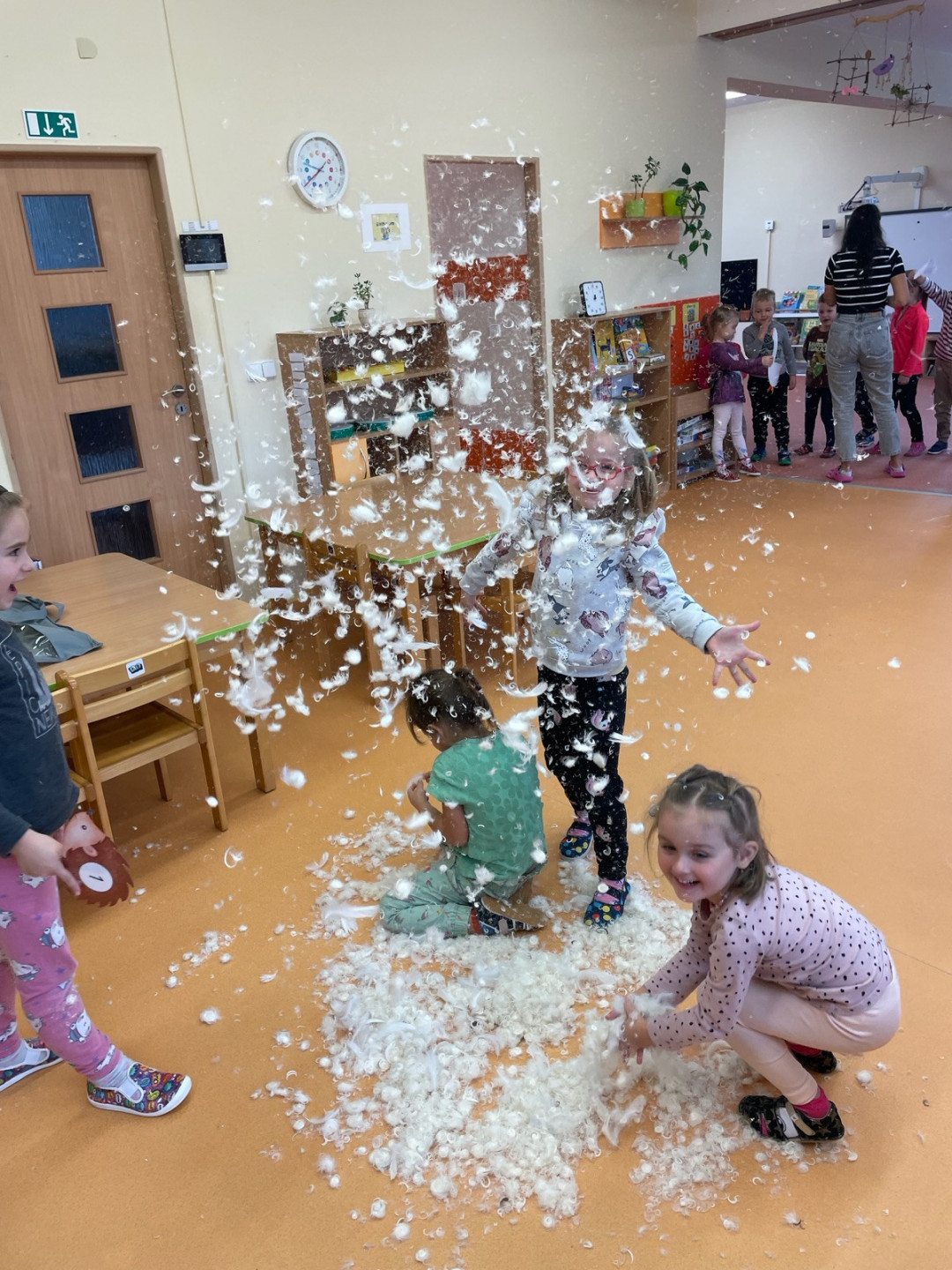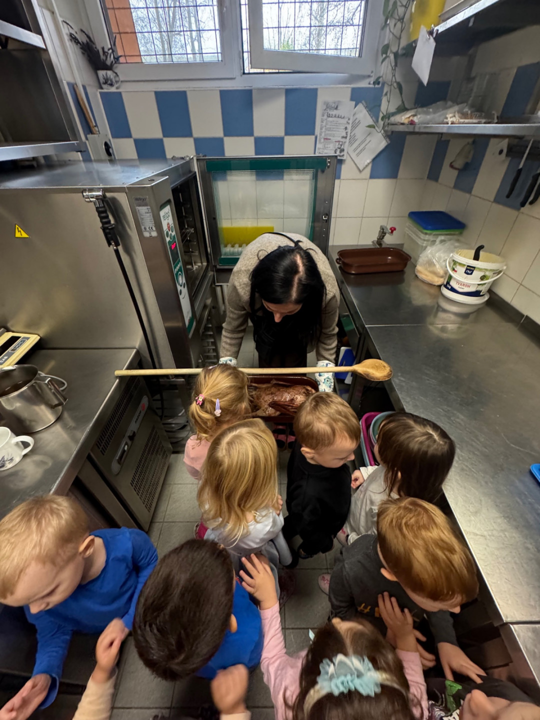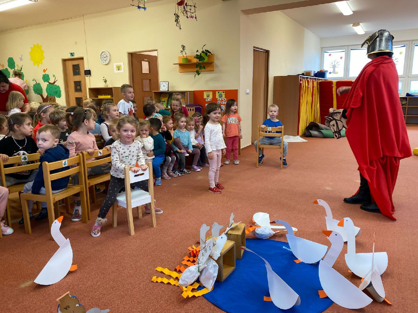 Učitelky si pro děti připravily divadelní představení – legendu o svatém Martinovi, jeho laskavosti a pomoci bližním. Součástí příběhu byla i oblíbená husa „Praskačka“. A ta nezůstala jen na jevišti. Společně s dětmi jsme ji totiž symbolicky „připravovali“ – omyli, nasolili, okmínovali a vložili do trouby, tak jako v mnoha českých rodinách.