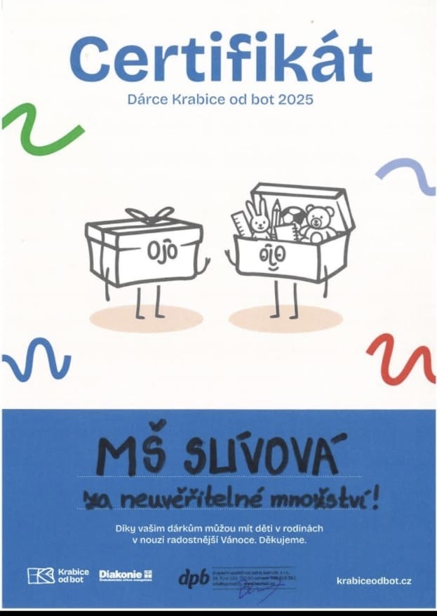 Naše MŠ Slívova se letos poprvé zapojila do dobročinné sbírky Krabice od bot. S velkou radostí oznamujeme, že sbírka byla velmi úspěšná. Zapojilo se mnoho rodičů, kteří společně připravili a darovali přibližně 30 krásně zabalených dárků pro děti v náročných situacích.